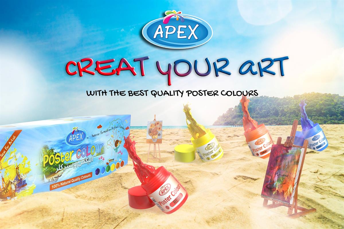 Apex A-1212P Jumbo Poster Colour with Superior formulation and brilliant colours. 100% natural quality colours in 30 ml/cc Volume. Poster colours deliver a fantastic variety of smooth bright colours. Non-toxic material. Free brush inside. Available in 12 assorted colours.