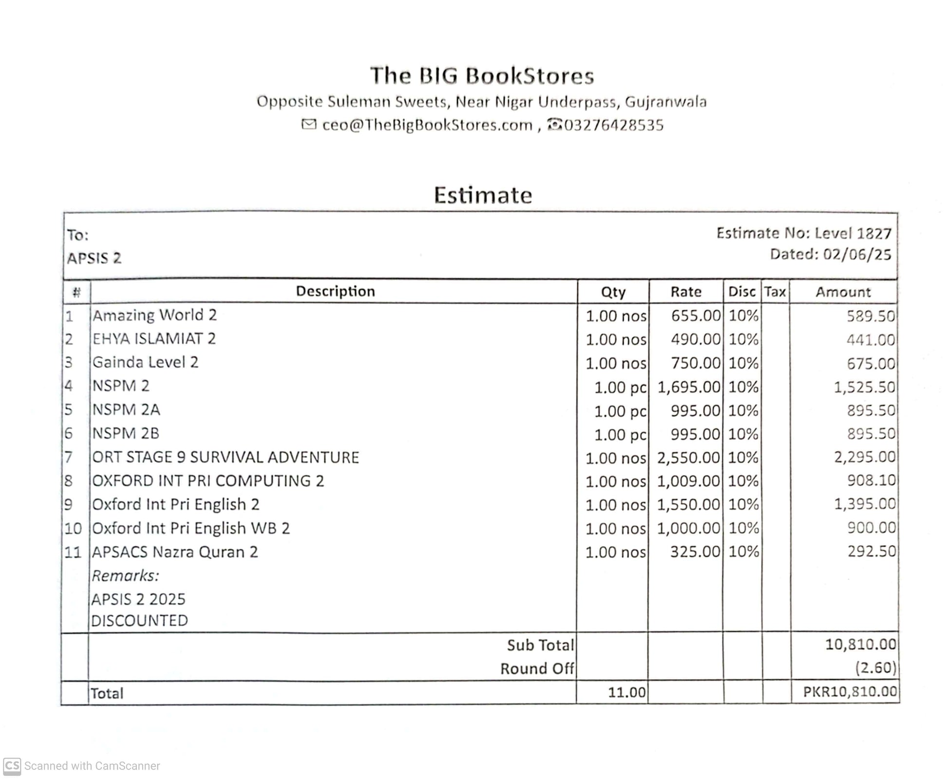 | 10 | Oxford Int Pri English WB 2 | 1.00 nos | 1,000.00 | 10% | 900.00 | |
